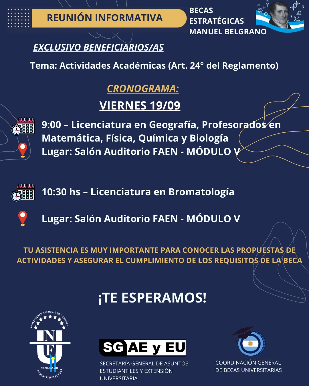 A las 9 horas, en el Salón Auditorio de la FAEN (Módulo V), se hará la reunión para los beneficiarios de las carreras: Licenciatura en Geografía, Profesorados en Matemática, Física, Química y Biología.
