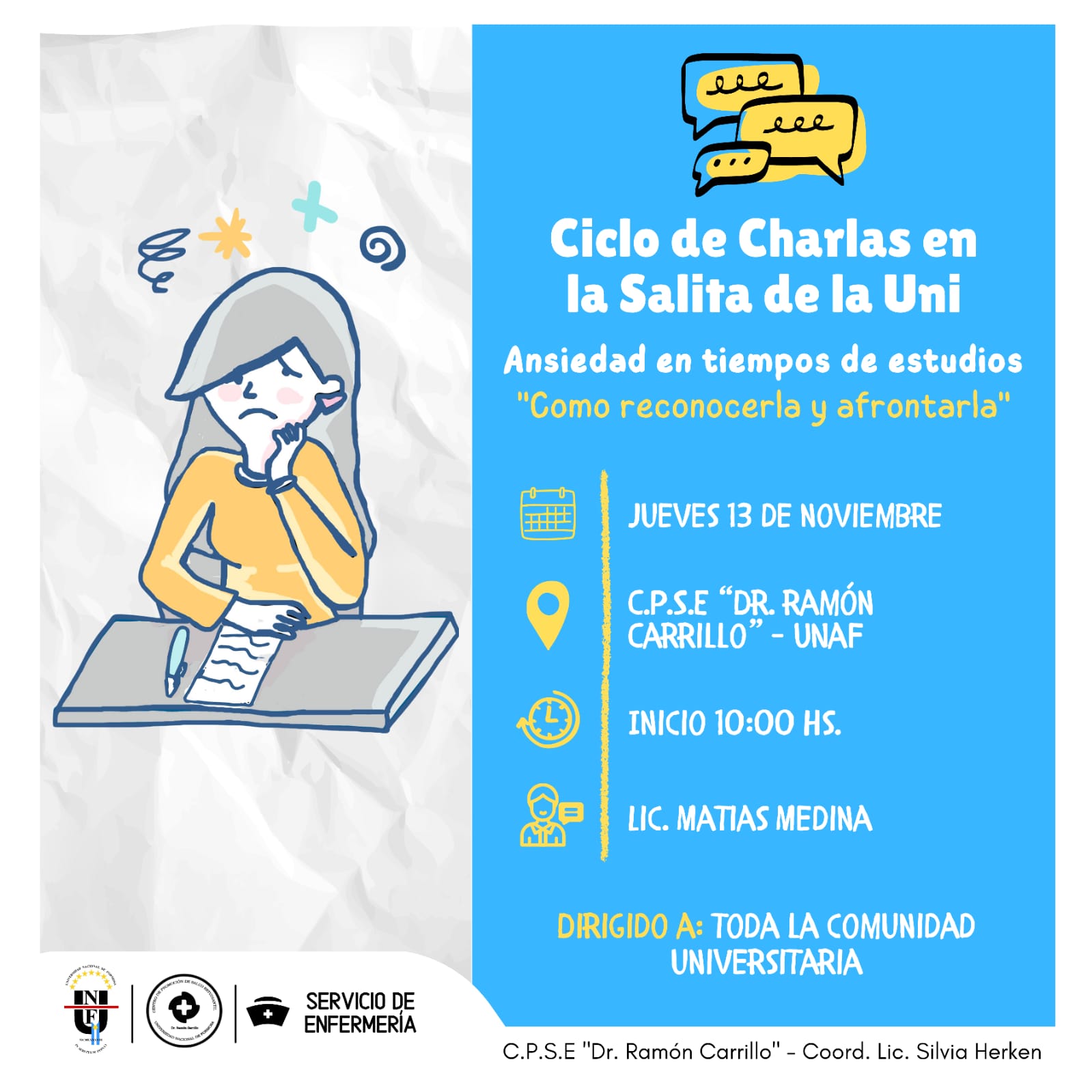 La charla será “Ansiedad en tiempos de estudios: Cómo reconocerla y afrontarla”, donde se abordarán herramientas para identificar los signos de ansiedad, comprender sus causas y aprender estrategias prácticas para afrontarla de manera saludable durante los períodos de estudio y exámenes.