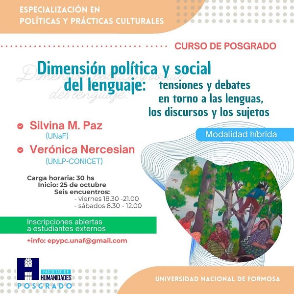 Desde la Facultad de Humanidades de la Universidad Nacional de Formosa (FH-UNaF) informan sobre la realización del curso de posgrado denominado “Dimensión política y social del lenguaje: tensiones y debates en torno a las lenguas, los discursos y los sujetos”.