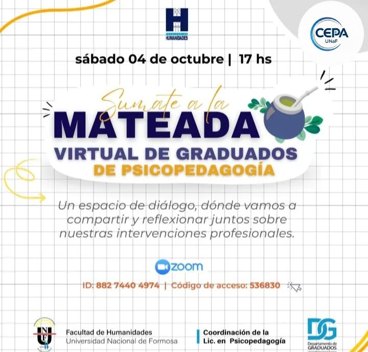 La Facultad de Humanidades de la Universidad Nacional de Formosa, a través de la Coordinación de la Licenciatura en Psicopedagogía y la Dirección del Departamento de Graduados, invita a todos los graduados a participar de una mateada virtual que se llevará a cabo el próximo sábado 4 de octubre a las 17 horas.