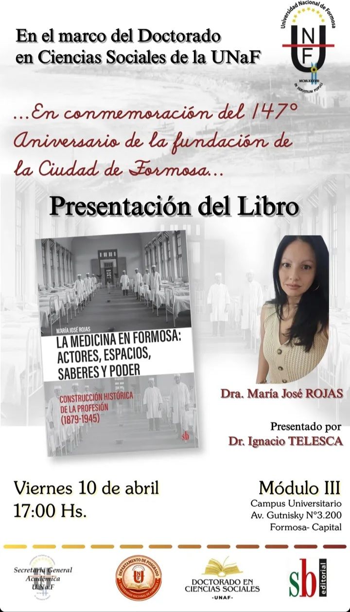 En el marco del Doctorado en Ciencias Sociales de la Universidad Nacional de Formosa (UNaF), se realizará la presentación del libro “La medicina en Formosa: actores, espacios, saberes y poder. Construcción histórica de la profesión (1879-1945)”, de la Dra. María José Rojas.
