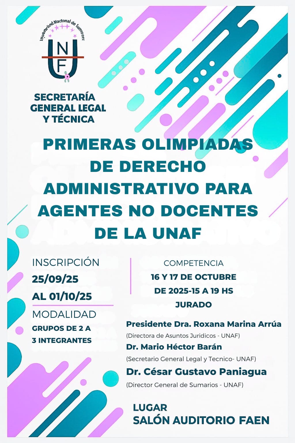 El jurado estará integrado por: presidente: Dra. Roxana Marina Arrúa -directora de Asuntos Jurídicos de la Secretaría General Legal y Técnica de la UNaF; Dr. Mario Héctor Barán, secretario general Legal y Técnico de la UNaF; y Dr. César Gustavo Paniagua, director general de Sumarios de la Secretaría General Legal y Técnica de la UNaF.