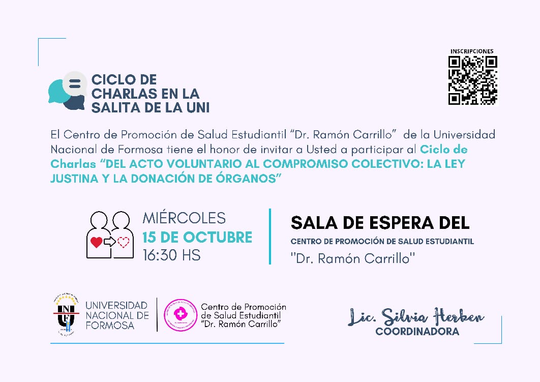 Según informó la coordinadora del Centro, Lic. Silvia Herken, la misma se titula “Del acto voluntario al compromiso colectivo: la Ley Justina y la donación de órganos”, invitando a todos los interesados a participar de estas actividades pensadas para informar, concientizar y abrir espacios de debate sobre temas actuales de salud.