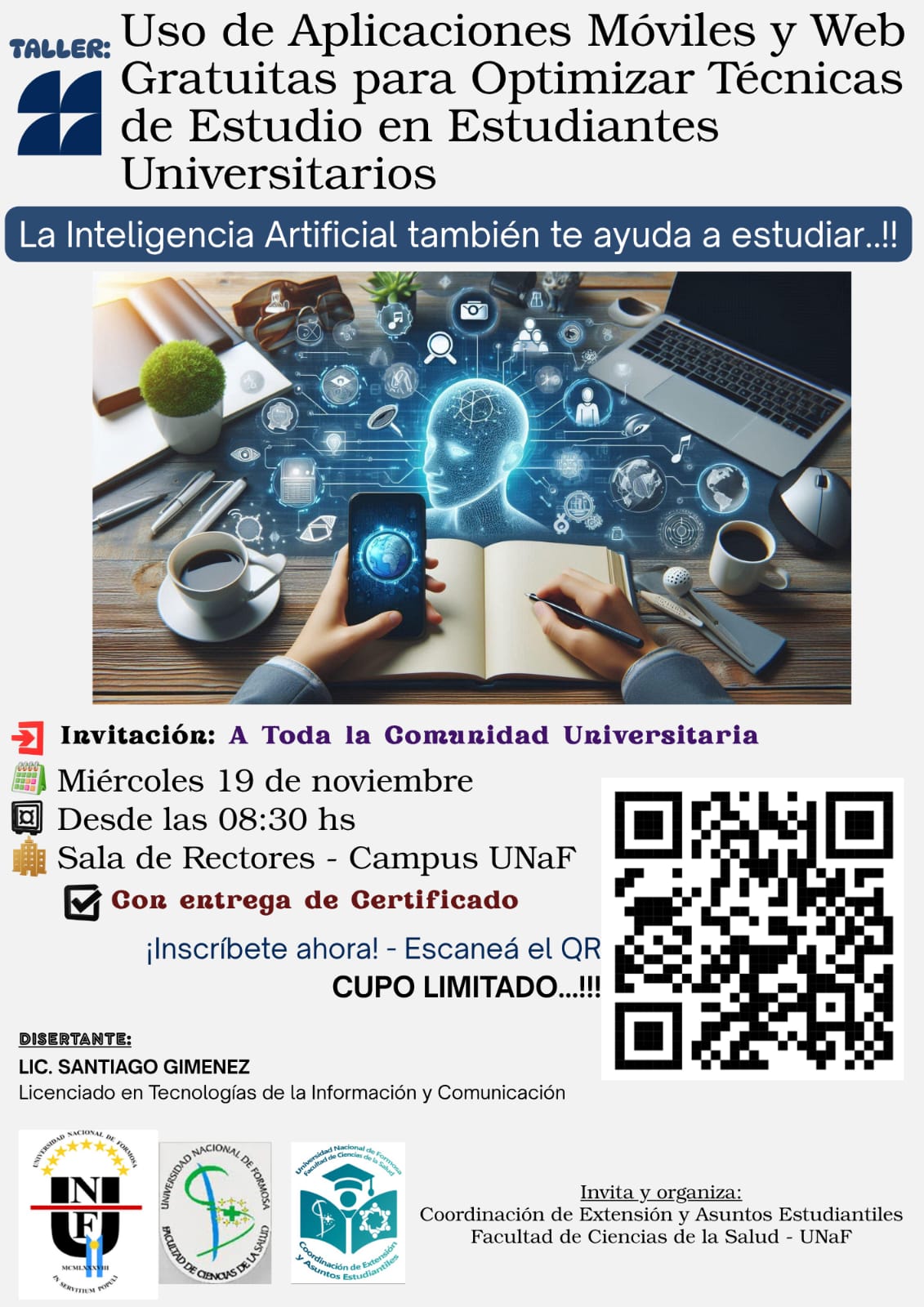 El próximo miércoles 19 de noviembre, desde las 8.30 horas, en la Sala de Rectores de la Universidad Nacional de Formosa (UNaF), se llevará a cabo un taller denominado “Uso de aplicaciones móviles y web gratuitas para optimizar técnicas de estudio en estudiantes”, dirigido a toda la comunidad universitaria y con entrega de certificados a los asistentes.